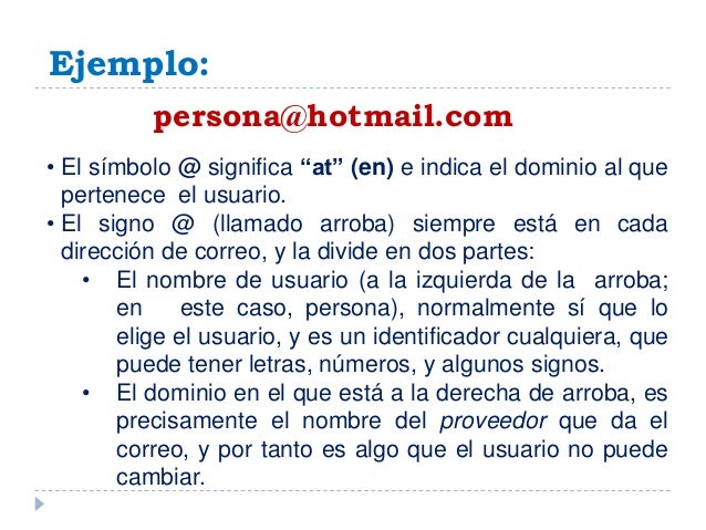 - 10. Ejemplo: • El símbolo @ significa “at” (en) e indica el dominio al que pertenece el usuario. • El signo @ (llamado arroba) siempre está en cada dirección de correo, y la divide en dos partes: • El nombre de usuario (a la izquierda de la arroba; en este caso, persona), normalmente sí que lo elige el usuario, y es un identificador cualquiera, que puede tener letras, números, y algunos signos. • El dominio en el que está a la derecha de arroba, es precisamente el nombre del proveedor que da el correo, y por tanto es algo que el usuario no puede cambiar. persona@hotmail.com