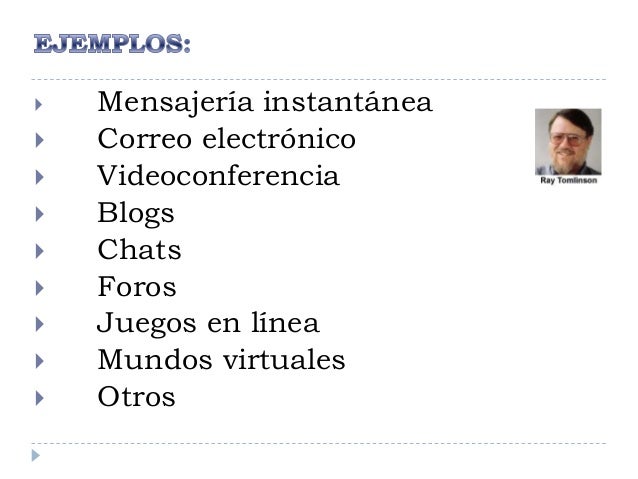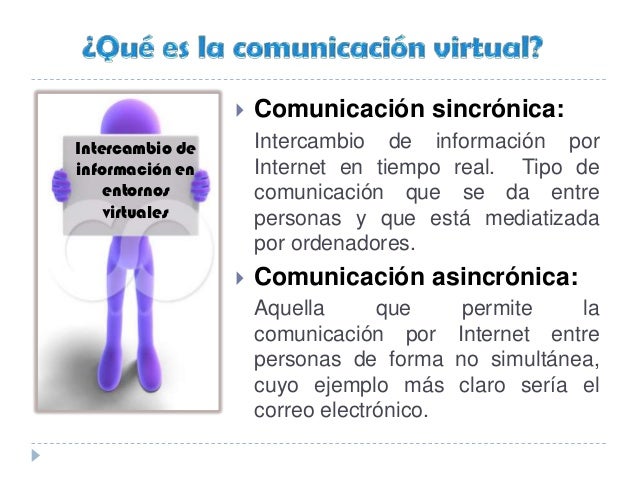 - 2. Comunicación sincrónica: Intercambio de información por Internet en tiempo real. Tipo de comunicación que se da entre personas y que está mediatizada por ordenadores. Comunicación asincrónica: Aquella que permite la comunicación por Internet entre personas de forma no simultánea, cuyo ejemplo más claro sería el correo electrónico. Intercambio de información en entornos virtuales