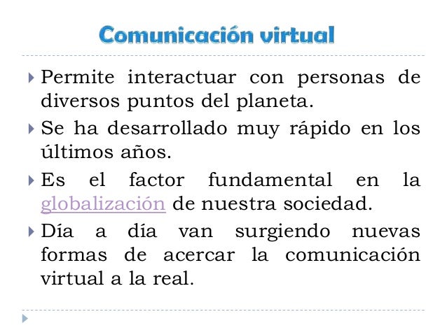 - 3. Permite interactuar con personas de diversos puntos del planeta. Se ha desarrollado muy rápido en los últimos años. Es el factor fundamental en la globalización de nuestra sociedad. Día a día van surgiendo nuevas formas de acercar la comunicación virtual a la real.