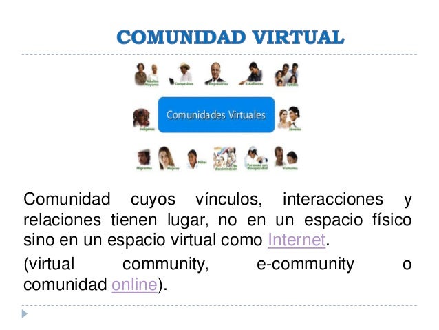 - 4. Comunidad cuyos vínculos, interacciones y relaciones tienen lugar, no en un espacio físico sino en un espacio virtual como Internet. (virtual community, e-community o comunidad online).