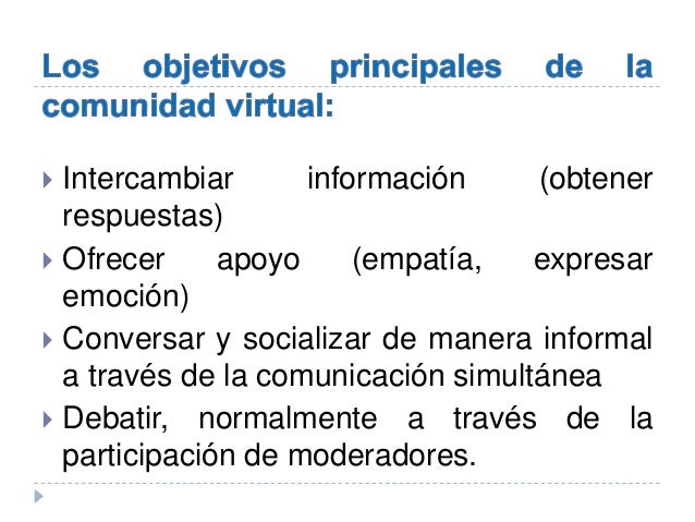 - 5. Intercambiar información (obtener respuestas) Ofrecer apoyo (empatía, expresar emoción) Conversar y socializar de manera informal a través de la comunicación simultánea Debatir, normalmente a través de la participación de moderadores.