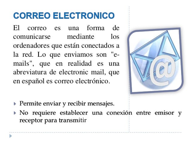 - 7. El correo es una forma de comunicarse mediante los ordenadores que están conectados a la red. Lo que enviamos son "e- mails", que en realidad es una abreviatura de electronic mail, que en español es correo electrónico. Permite enviar y recibir mensajes. No requiere establecer una conexión entre emisor y receptor para transmitir