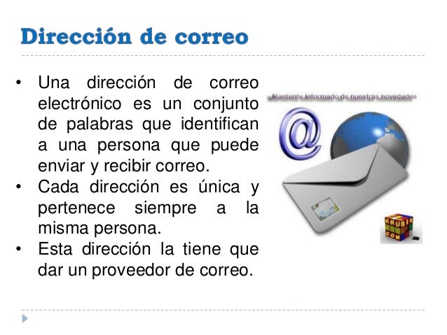 - 8. • Una dirección de correo electrónico es un conjunto de palabras que identifican a una persona que puede enviar y recibir correo. • Cada dirección es única y pertenece siempre a la misma persona. • Esta dirección la tiene que dar un proveedor de correo.