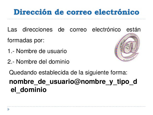 - 9. Las direcciones de correo electrónico están formadas por: 1.- Nombre de usuario 2.- Nombre del dominio Quedando establecida de la siguiente forma: nombre_de_usuario@nombre_y_tipo_d el_dominio